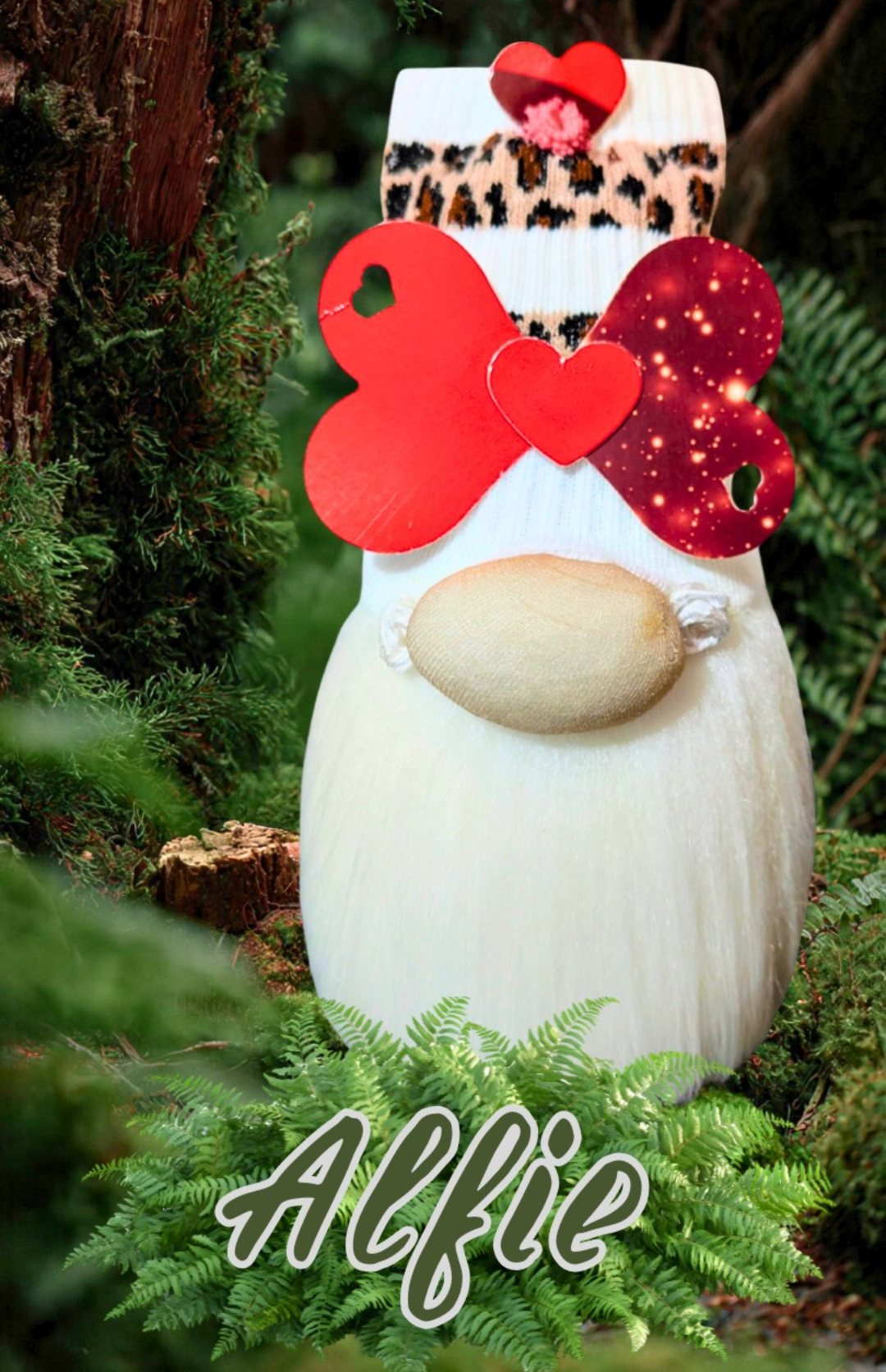 With his soft white beard, cosy leopard-print hat band and playful heart details, Alfie wears his story proudly.